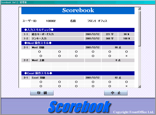 Scorebookとは、パソコンスキルを簡単に正確に判断できるソフトです。 これまでのスキルをチェックは、実際のパソコンを使って行うことはできても、採点は手動で行わなければならず、手間と時間がかかる上に正確に行えないという欠点がありました。 こうした不便さを一気に解決してくれるのがScorebookです。 Scorebookはパソコン操作の採点を自動的に行います。もちろん、同一の判断基準ですから、採点が不平等になることもありません。Scorebookを使用することで、正確なスキルチェックが 瞬時に簡単に行うことができるのです。 |